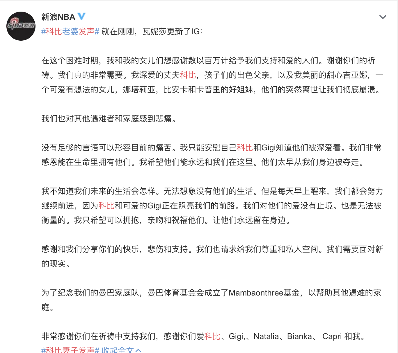 独自撑起一个大家庭,没有任何心理准备,这无疑是整个世界的崩塌。当然,瓦妮莎还是坚强的,在这样的关头,她没有倒下,还是站起来处理科比的后事。