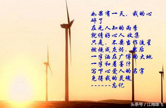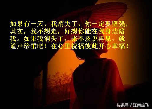 如果有一天,我离你而去,那绝不是我停止了思念,在曾经走过的路口,你一定会看到被风卷起的树叶,那上面留着,你不曾开启的信笺;如果有一天,我离你而去,也绝不是我害怕孤单,在随行的风口浪尖,你一定能听到一种呼唤,那里面饱含,你不曾知道的期待;如果有一天,我离你而去,那绝不是我迷茫失意,在泪倾满城的梦里,你一定能感受到一种气息,在气息里面,装的全都是你。