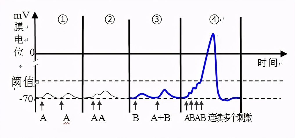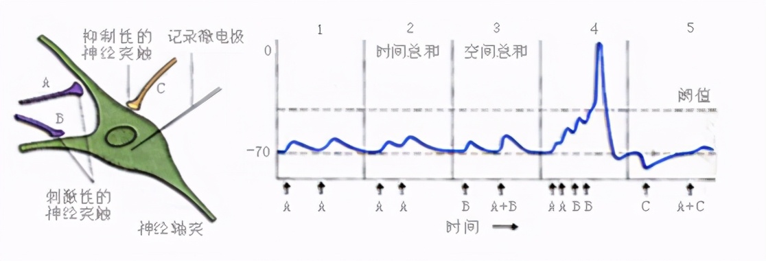 高等动物中枢每一突触后神经元上通常形成大量的突触(包括兴奋性和抑制性的),猫脊髓前角的一个运动神经元胞体上形成1200~1800个突触,约占据神经元胞体表面的38%。神经元通过对epsp和ipsp进行空间总和(即对在神经元不同位置上出现的epsp和ipsp进行总和)和时间总和(即对每个突触重复发生的突触后电位进行总和),以决定它产生兴奋还是抑制。总和后,如兴奋性突触后电位达到阈值,便触发动作电位。在突触传递中递质一旦释放,无论是否已与受体结合,便又迅速地被分解或被重吸收到突触口内或扩散离开突触间隙,使突触得以为下次传递作好准备。