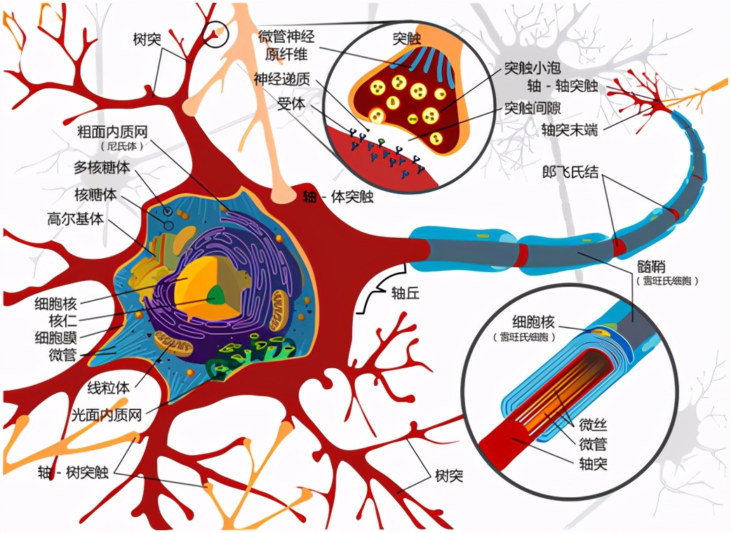 每个神经元可以有一或多个树突,可以接受刺激并将兴奋传入细胞体。每个神经元只有一个轴突,可以把兴奋从胞体传送到另一个神经元或其他组织,如肌肉或腺体。