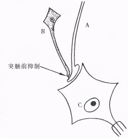 机制:如图,神经元b与神经元a构成轴突-轴突式突触;神经元a与神经元c构成轴突-胞体式突触。神经元b没有对神经元c直接产生作用,但它可通过对神经元a的作用来影响神经元c的递质释放。须指出的是,只有在神经元a也处于激活状态时,神经元b才能对a发挥抑制作用。