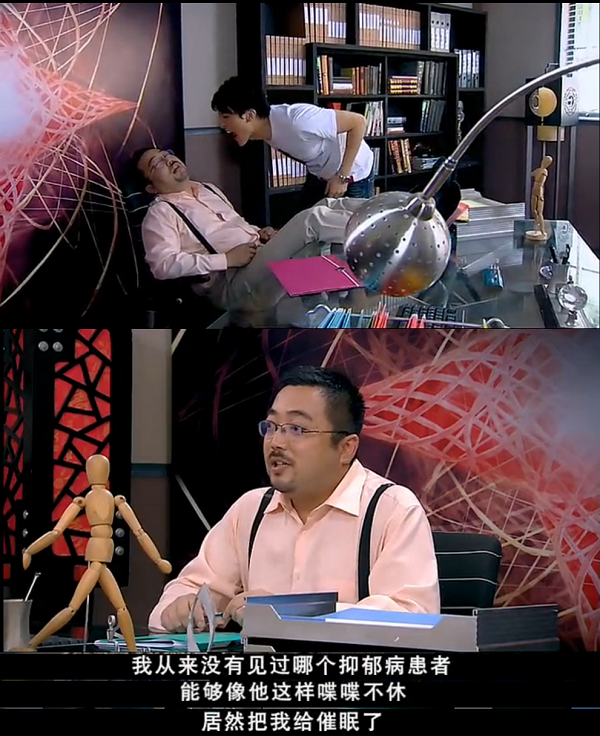吕子乔假装情绪抑郁,在咨询室里喋喋不休,心理医生听着听着睡着了。子乔因此偷看到了放在桌子上的曾小贤的咨询档案。医生在对曾小贤和胡一菲解释子乔的状态时,提到子乔“居然把我给催眠了”。