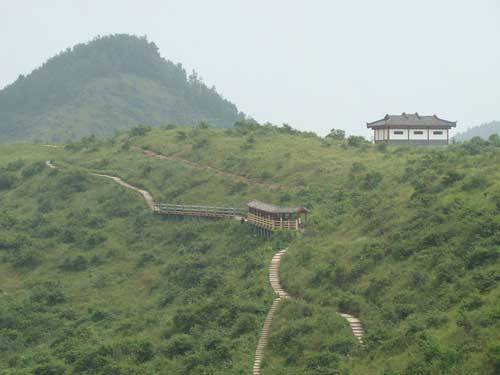山南有一个天然锅底形的大洼,周长1.5千米,即三国时称为“可屯万兵”的“仰天洼”。北麓有一片广漠沃野,就是当年诸葛亮大布“八阵图”、设“督军坛”的武侯坪,黄忠大战夏侯渊的战场,时常发现“扎马钉”和箭镞,传为蜀军用兵之物;山旁有“斩将桥”,“八角琉璃井”井口八角形,薄页细花纹汉砖砌成,皆不存。山半腰有一大石,高约3.3米,宽约2米,中开一缝,宽窄不一,名曰“挡箭牌”,传为诸葛亮遮挡敌箭的遗物。