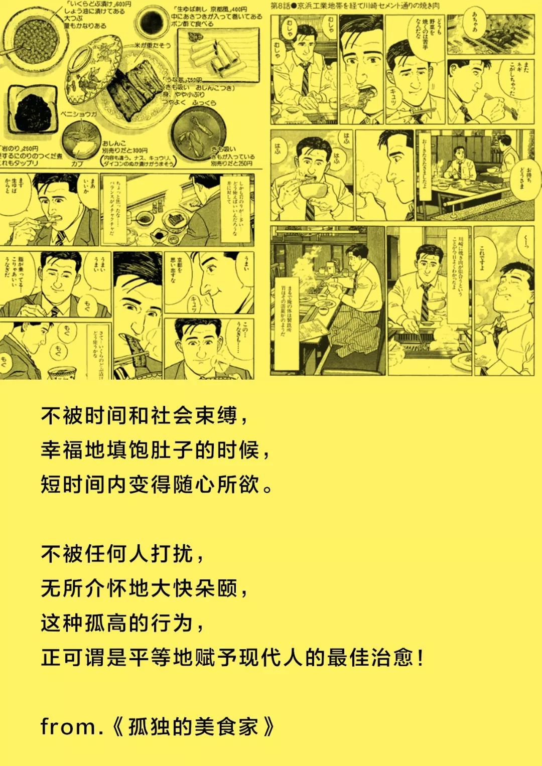 展现的只是五郎叔本本分分地吃、老老实实地表现食物的美味,食物是《孤独的美食家》绝对的主角,五郎叔在食物面前其实是个“配角”。