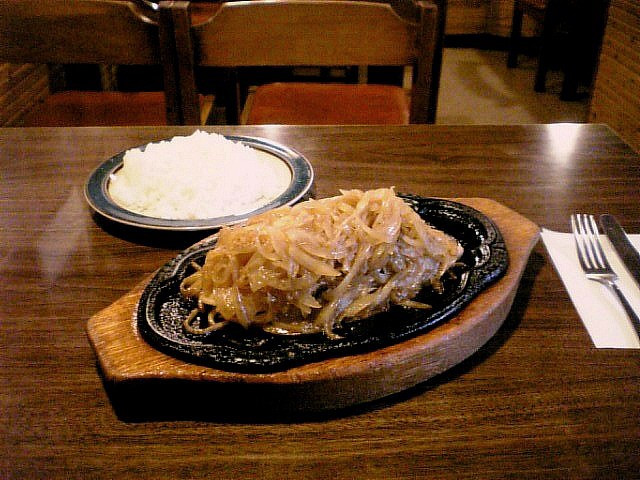 五郎点食的是店里的招牌“特别友风烧”,其实就是蒜味葱爆猪肉,一上来味道就极其诱人,“兹拉兹拉”的铁板声更是加剧了食欲。还有猪肉酱汤、火腿土豆沙拉、友风铁板汉堡、炸猪排套餐都相当推荐。小店味道不错,但是价钱感觉偏贵,量也比想象中的小。