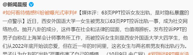 最近,在西安某大学发生了一件关于出轨的争议事件,引起了社交网络的广泛关注。男子用63页的ppt控诉他的女友出轨,这引发了很大的争议。男子表示,他们从2022年底开始交往,但在过去一年里,女友和两个前男友都有出轨行为。