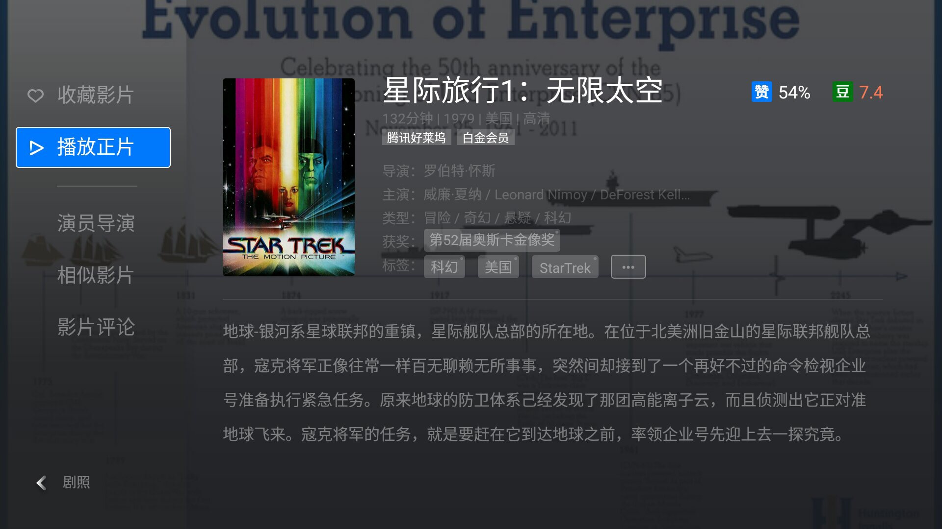 这是一部1979年在美国上映的一部老片子。影片由好莱坞巨头派拉蒙影业公司出品,很有年代感的科幻片,但却收获好评无数。电影讲述了寇克船长奉命最后一次指挥企业号宇宙飞船对抗外星人对地球的大规模攻击的故事。