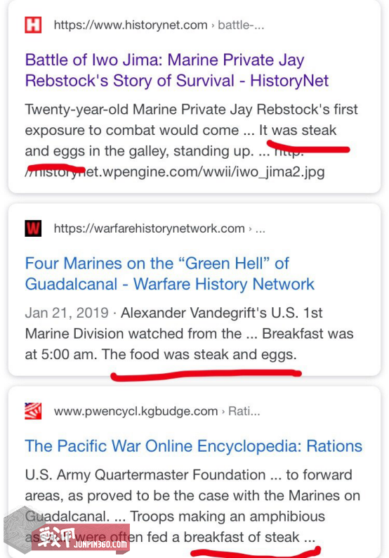 说回正题,steak and eggs事实上是太平洋战争期间流行开来的产物。按照惯例,美国海军的运兵船在登陆行动的前夕都会为准备上岸作战的士兵们端上steak and eggs,作为一种激励士气的手段。