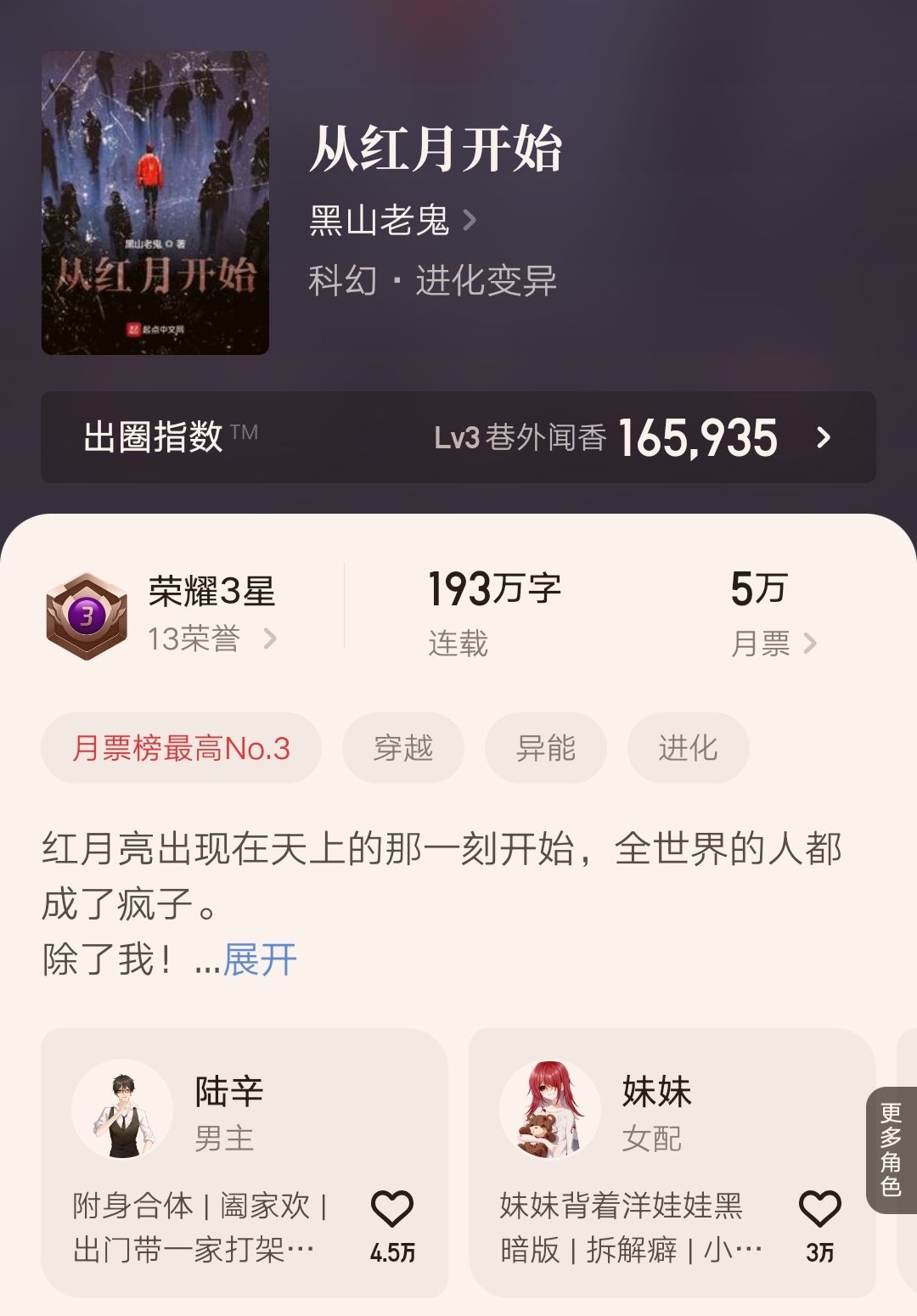 老鹰的新书目前走得还是都市玄幻的路子,不过结合了时下比较流行的诡异类元素。至于黑山老鬼的《从红月开始》则是末世废土文类型。他从仙侠转型到科幻,结果意外造就了自己网文生涯的一次巅峰,不得不说还是很奇妙的。