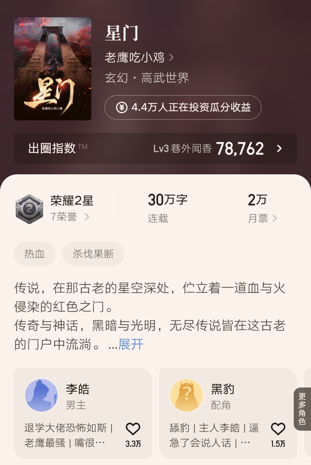 这两天起点新晋白金大神老鹰吃小鸡的新书《星门》迎来了开书以来的第一个大高潮, 不知道大家有没有关注呢?