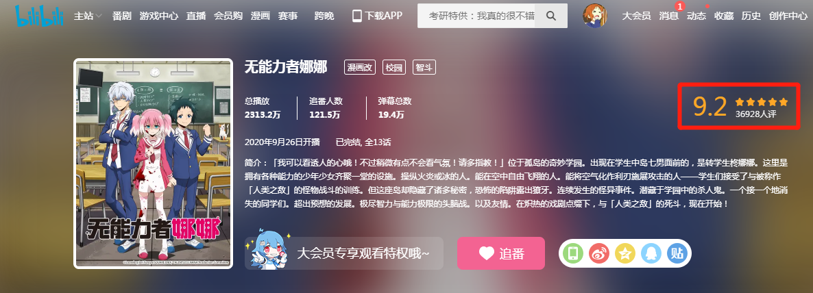 《无能力者娜娜》讲述的是一位名叫柊娜娜的无能力者混入班级当中暗杀能力者的故事,起初这部作品由于太过于黑暗也导致一度成为了十月新番中垫底的存在,然而随着剧情的发展,越来越多的精彩内容慢慢的浮现在观众眼前,而在本次《无能力者娜娜》完结篇第13集【重生】更新之后,这部作品直接突破到9.2分,完虐《全员恶玉》和《成神之日》,成为了本次十月新番中“低开高走”的神作!