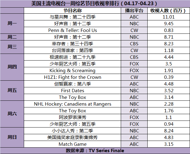 尽管国际模式节目呈现百花齐放的良好事态,在美国,老牌综艺节目《与星共舞》《好声音》《幸存者》依旧以绝对优势领跑各类综艺节目。在上周,这三档节目分列收视排行榜的前三名,分别吸引观众1101万、945万、832万。另外,nbc的《小小达人秀》表现不俗,收视观众达824万。